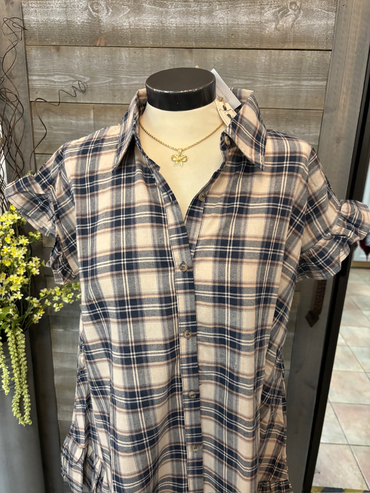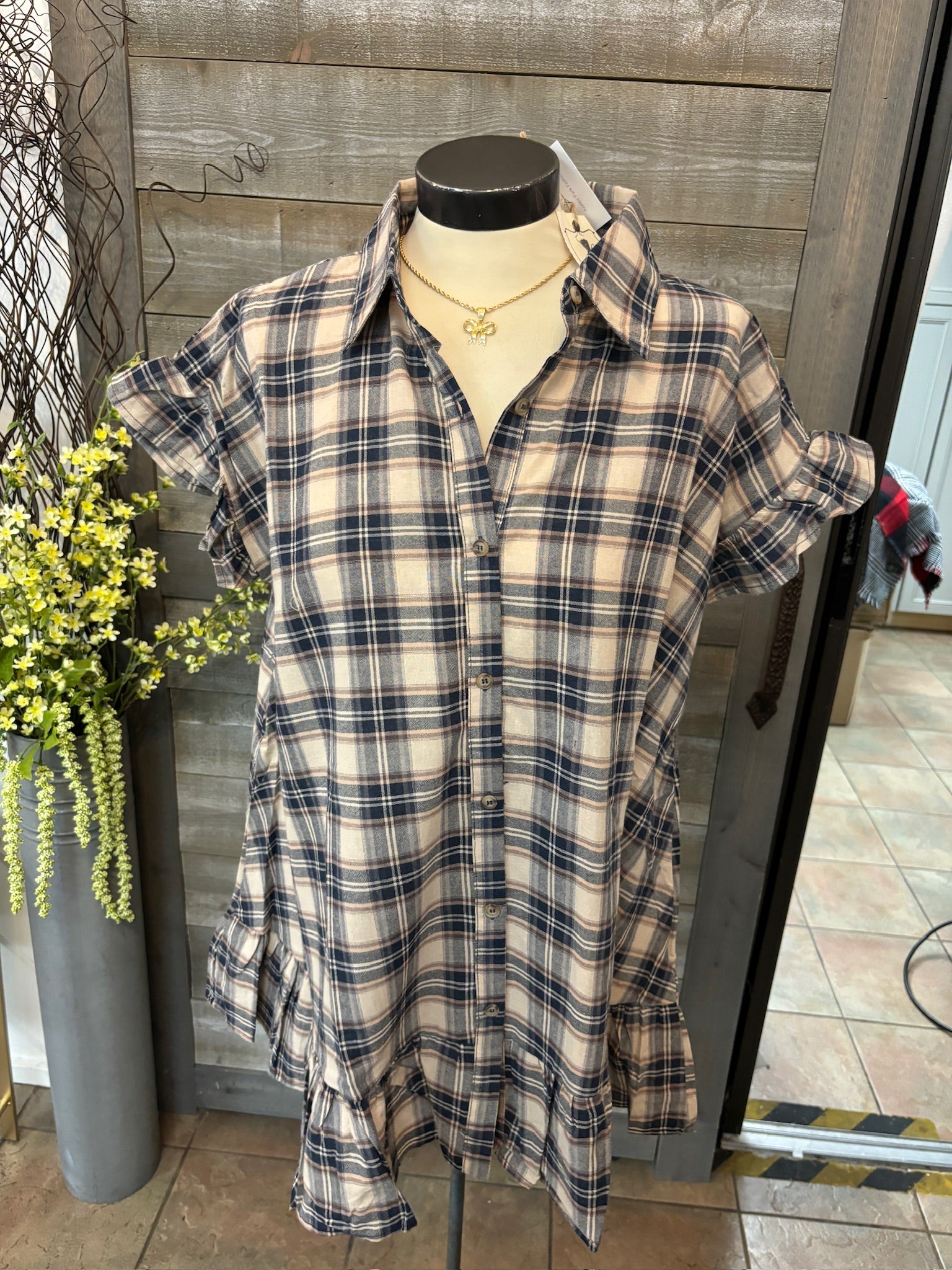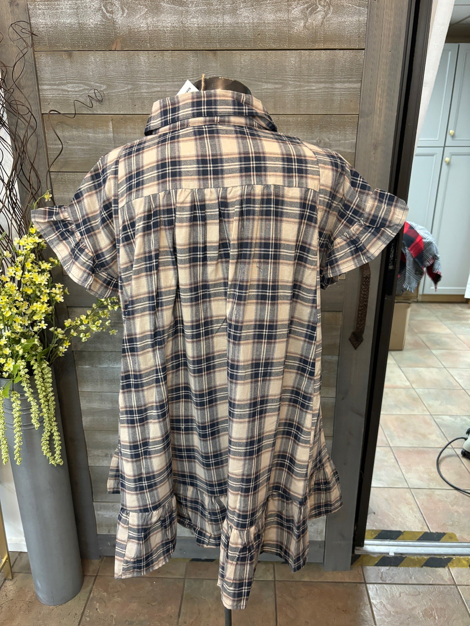 striped plaid blue and brown dress